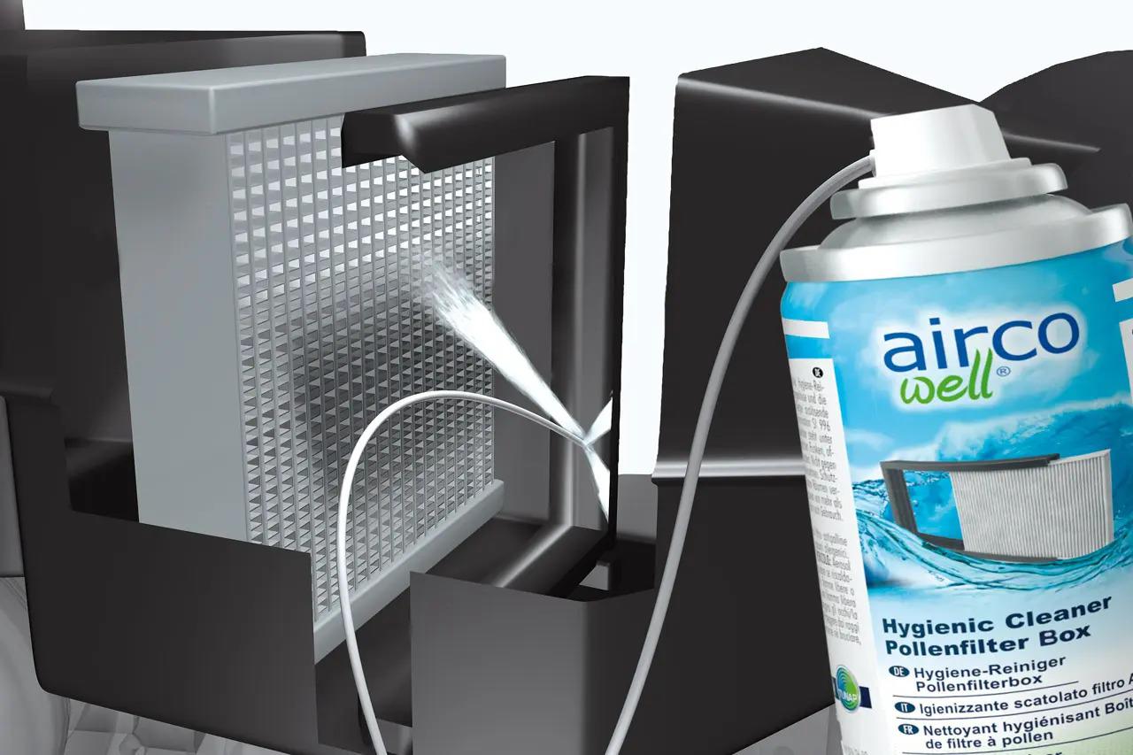 Warum ist das so wichtig? Dem Pollenfilter kommt in der Autoklimaanlage die Aufgabe zu, den größten Teil der Verschmutzungenaus der Umgebungsluft herauszufiltern, damit sie nicht auf den Verdampfer oder in denFahrzeuginnenraum gelangen. Ein Teil der Filtrate lagert sich jedoch in der Pollenfilterumgebungab. Da beim Wechsel des Pollenfilters meistens zusätzliche Partikel herunterfallen, muss geradedieser Bereich bei jedem Pollenfilterwechsel gereinigt werden.Wie funktioniert es? Der spezielle airco well Hygiene-Reiniger für die Pollenfilterbox kommt nach der Entnahme desverbrauchten Filters zum Einsatz. Die Pollenfilterbox und die angrenzenden Luftkanäle werdendabei für eine gründliche Reinigung gezielt mit dem Wirkstoff besprüht.Wie wirkt es? Durch die optimale Benetzung wird eine intensive Reinigungswirkung erzielt, die langfristig eineNeuansiedlung von Mikroorganismen (z.B. Pilze und Bakterien) im Pollenfiltergehäuse sowie denangrenzenden Luftkanälen verzögert.