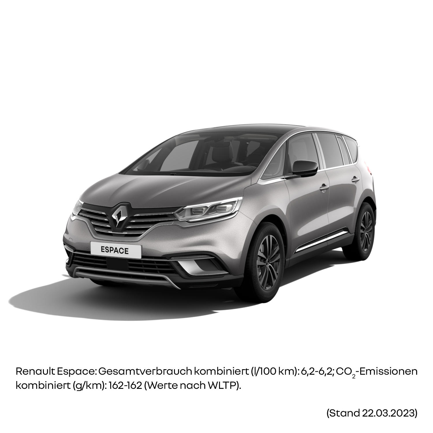 Willkommen in einer neuen Ära der Mobilität. Wieder setzt der Renault Espace beim Autohaus Schouren Maßstäbe beim Fahrzeugdesign: Seine einzigartigen Linien interpretieren den Begriff Crossover auf unverwechselbare Art. Selten wurde Funktionalität so elegant in Form gebracht. Und noch nie war der Renault Espace so begehrenswert. Ganz gleich, was Sie mit Ihrem neuen Espace vorhaben, Rufen Sie uns an wir beraten Sie sehr gerne. Renault Espace LIFE BLUE dCi 160 EDC, Diesel, 118 kW: Gesamtverbrauch (l/100km) innerorts: 5,7; außerorts: 4,8; kombiniert: 5,1; CO2-Emissionen kombiniert (g/km): 135.* Energieeffizienzklasse: A. (Werte nach Messverfahren VO [EG] 715/2007). Renault Espace: Gesamtverbrauch kombiniert l/100 km: 7,4 - 5,1; CO2-Emissionen kombiniert g/km: 168 - 135.* Energieeffizienzklasse: C - A.